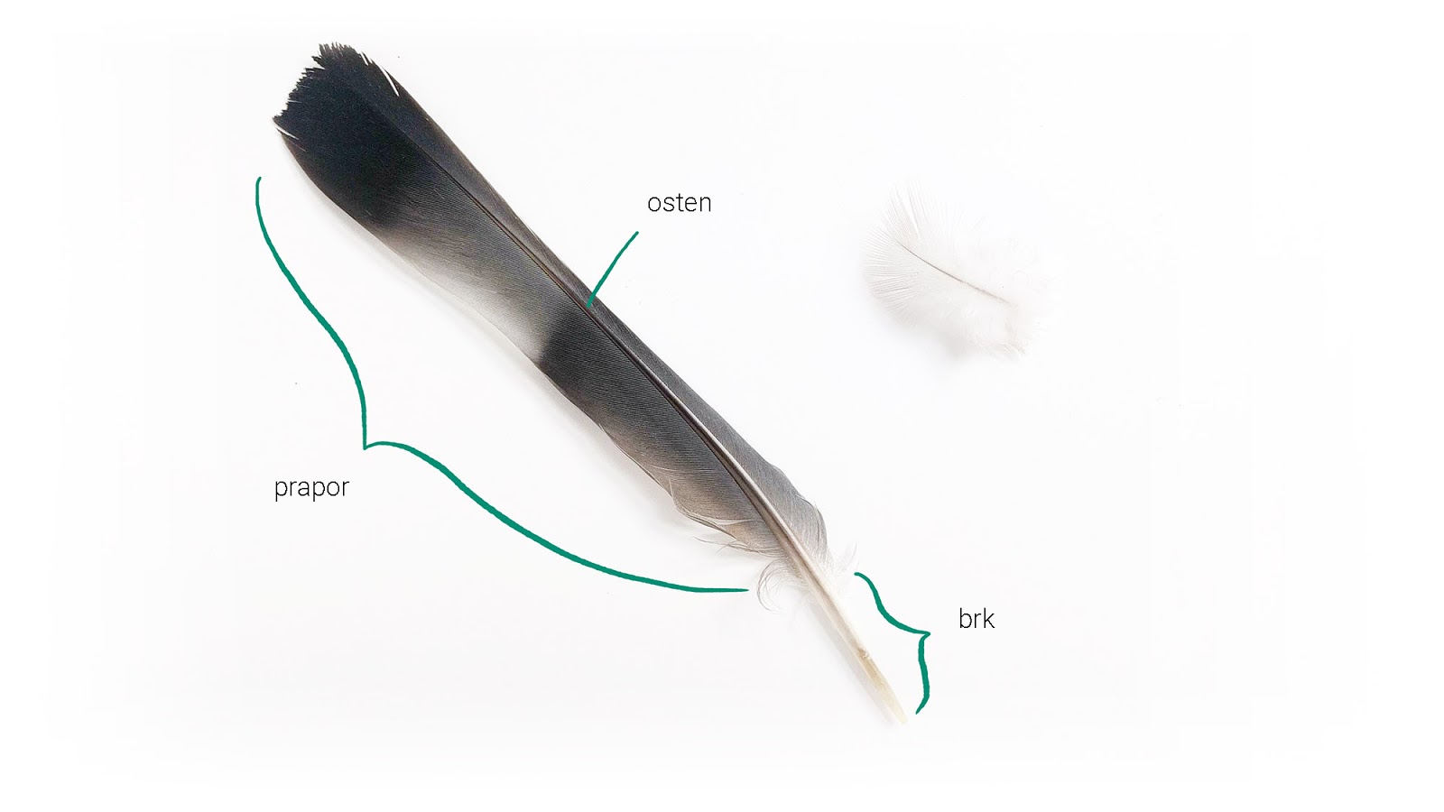 Druhů peří je několik. Většinou si všimneme obrysového peří. Ukažme si, jaká část je pro štětec ideální. Podle toho uzpůsobte na procházkách lov ;)